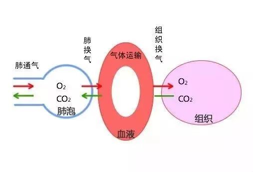 氧气--呼吸道--肺--肺泡--肺泡周围血管--血液循环--氧释放到组织--组织中CO2进入血液循环--回到肺泡--呼吸道--排出体外。