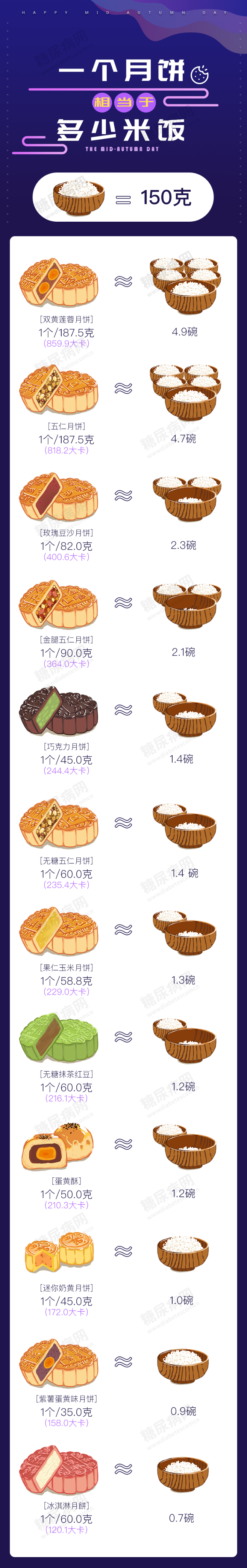 一碗150克熟米饭的热量为174千卡,而一个重187.5克的双黄莲蓉月饼,包装上的热量显示为859.9千卡,相当于4.9碗150克的熟白米饭。
