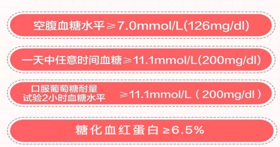 出现糖尿病典型症状并符合以下任何一个条件,可以诊断为糖尿病。