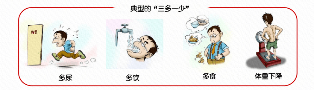 多饮、多食、多尿,体重减轻——俗称“三多一少”。