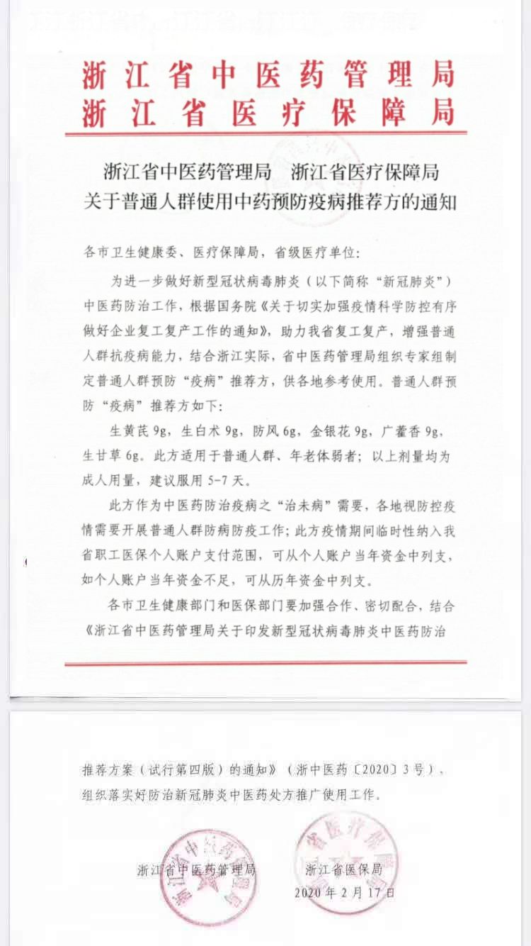根据中央应对新冠肺炎疫情工作领导小组会议提出的“强化中西医结合,促进中医药深度介入诊疗全过程,及时推广有效方药和中成药”的要求,2月17日,浙江省中医药管理局、浙江省医疗保障局联手推出“中药预防疫病推荐方”,并临时列入浙江省医保。