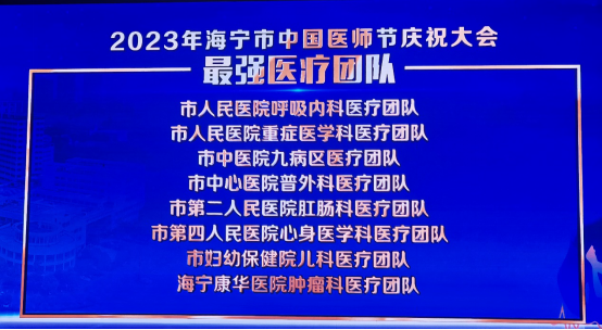 为了迎接2023年第六个“中国医师节”的到来,海宁市卫生健康局开展了潮城好医生评选活动。其中,我院窦安明主任以及肿瘤科医疗团队分别获评为2023年度“潮城好医生”以及“最强医疗团队”团队称号。