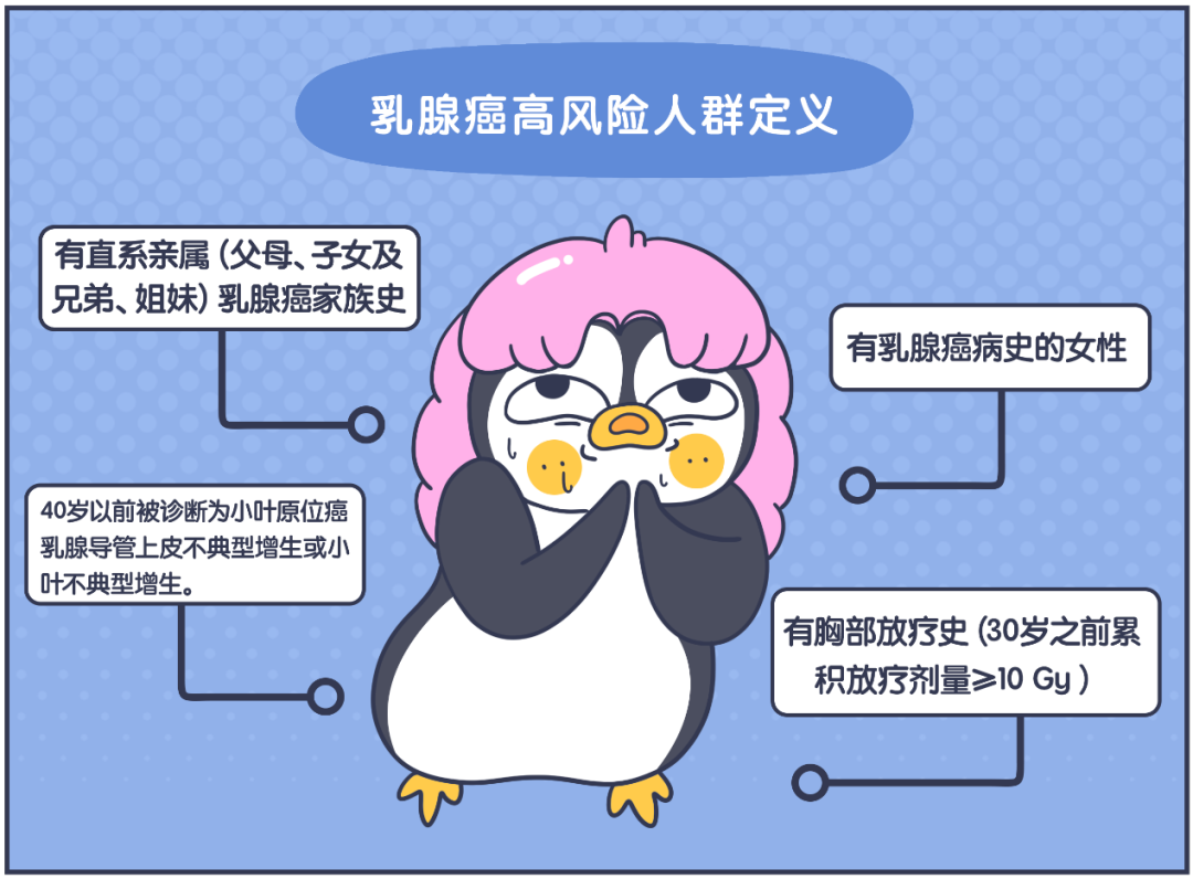 对于高风险人群,推荐小于40岁开展乳腺筛查,每年一次联合乳腺钼靶和乳腺超声检查,必要时还可以应用乳腺核磁等影像学手段。