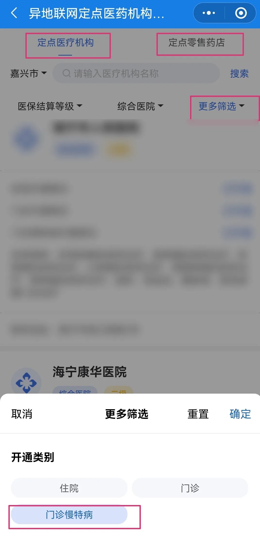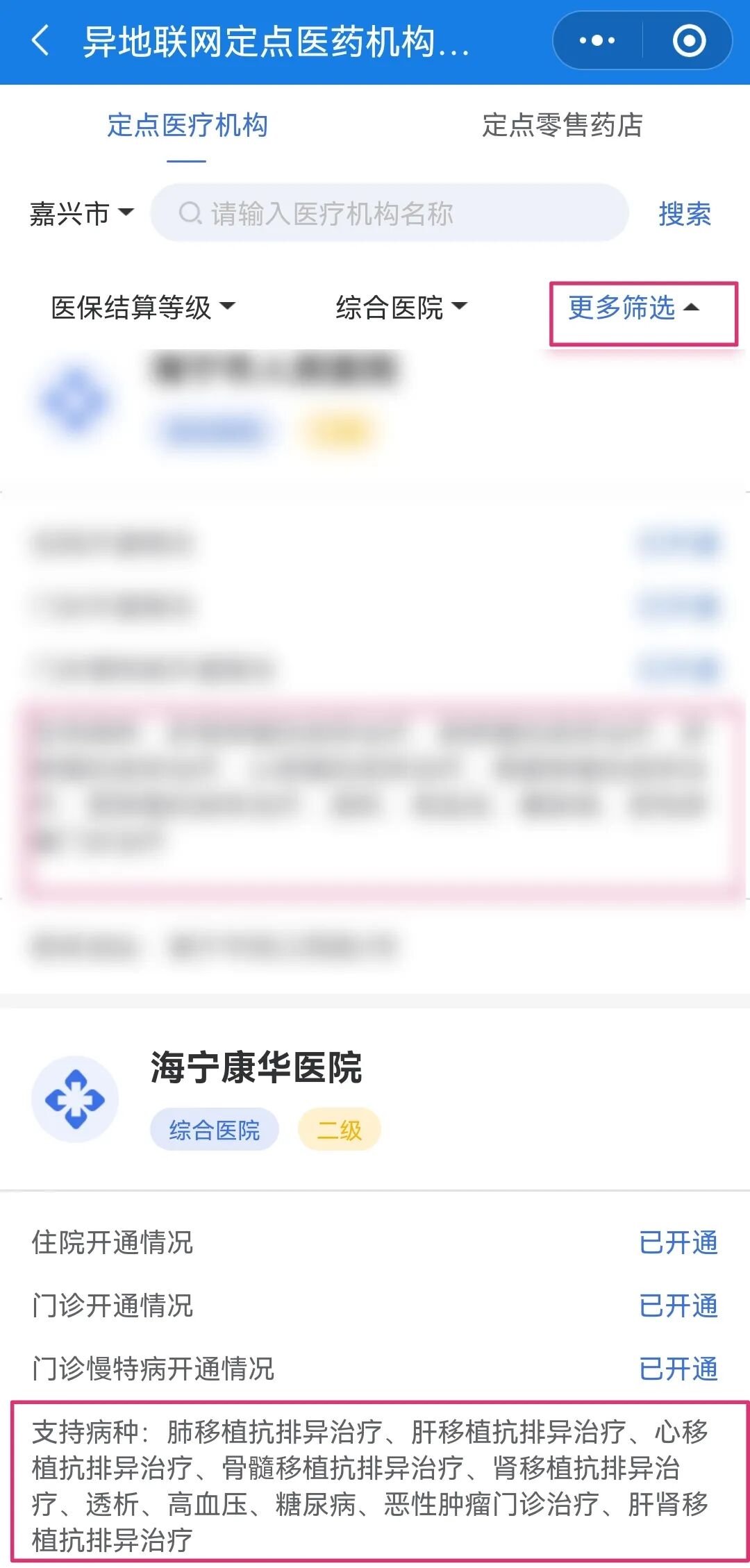 如您要查询哪些医院开通了门诊慢特病异地就医联网直接结算,您可以点击【更多筛选】,选择【门诊慢特病】,点击确定,即可看到目前已经开通门诊慢特病跨省异地就医直接结算的定点医疗机构,这里也可以看到医院支持的门诊慢特病病种。