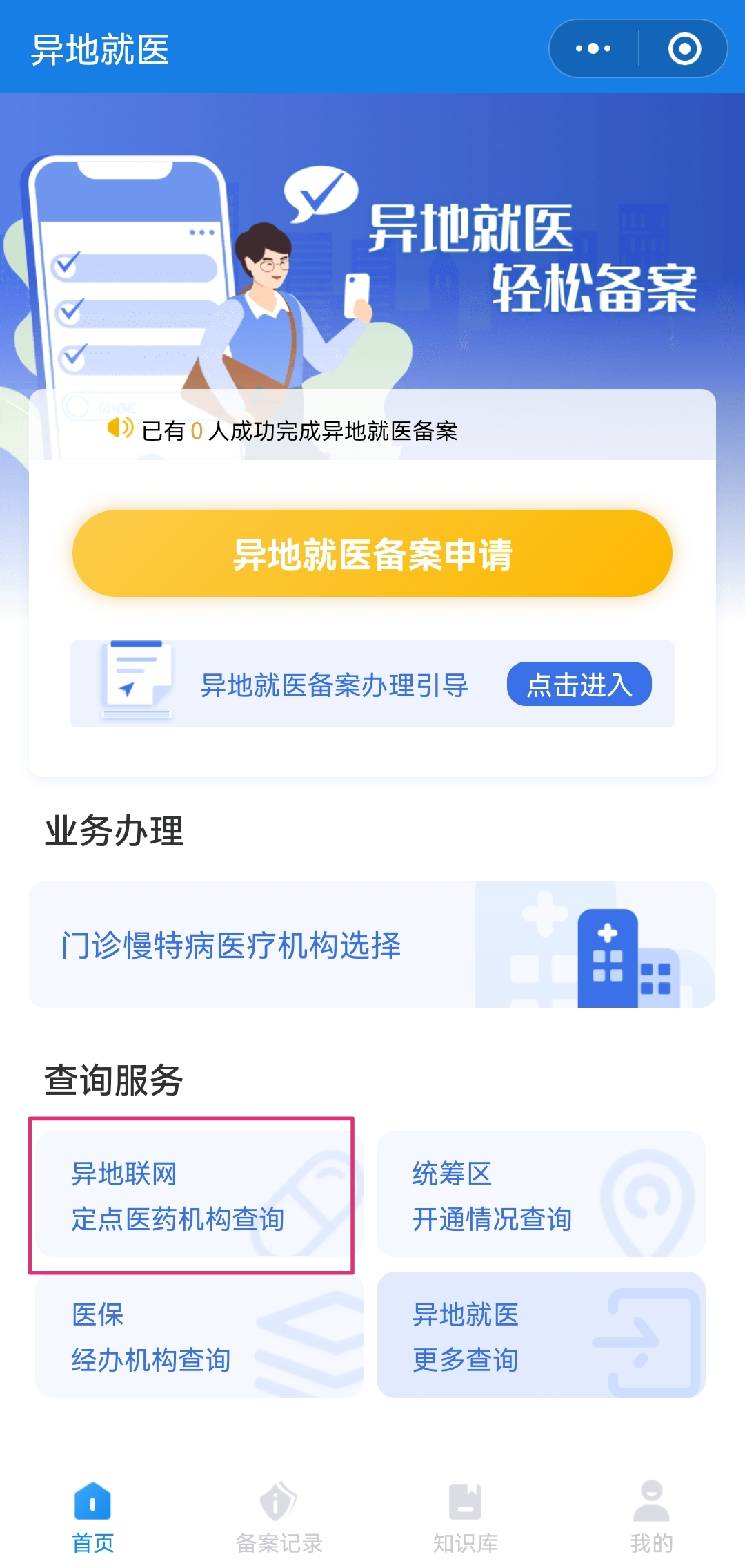 前往就医前,参保人员可以通过“国家异地就医备案微信小程序”、“国家医保服务平台”APP、“浙里办”APP“浙里医保”专区进行查询异地定点医药机构。进入国家异地就医备案微信小程序在主界面的查询服务模块中,点击【异地联网定点医药机构查询】,即可看到目前跨省异地就医直接结算的定点医疗机构,具体操作如下: