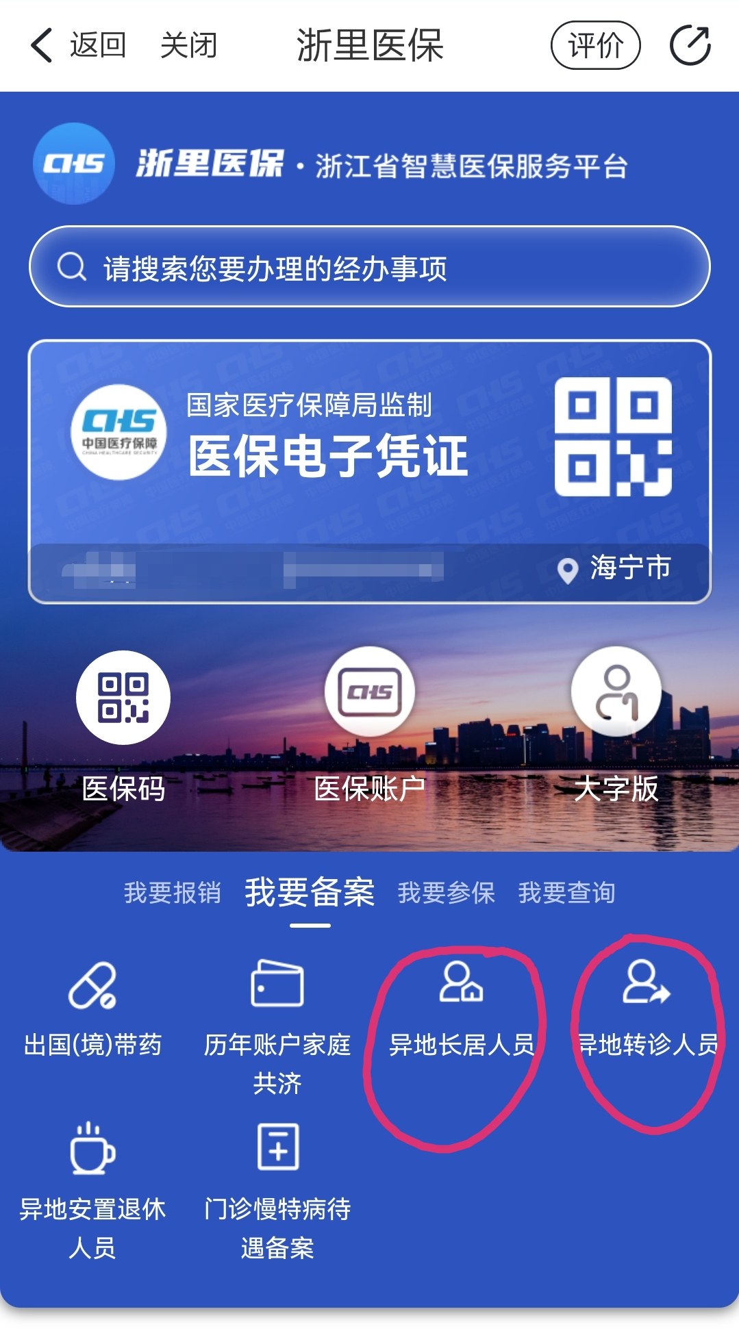 如果是异地长期居住人员,则选择“浙里办”浙里医保专区,“我要备案”中的“异地长居人员”模块进行办理 ;如果是因病异地转诊就医人员,则选择“异地转诊人员”模块进行办理,填写前往城市、起止时间、地址等信息即可在线办理。如果异地就医地或参保关系发生变化,需要取消备案记录,也可在该模块中办理。