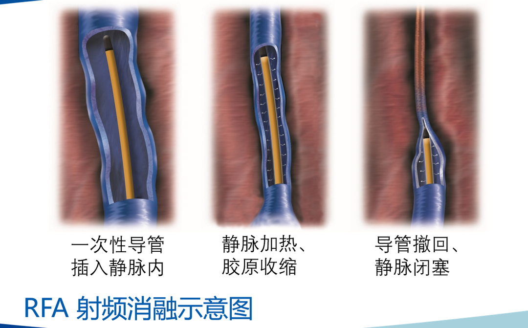 过去,传统治疗方法是开刀,创伤大、伤口多、出血多、并发症多、住院时间长等缺点,因此被各种微创手术替代,如泡沫硬化、射频消融等。射频消融术通过施加在血管腔内的射频能量,使血管纤维化,从而闭合血管,达到治疗目的。