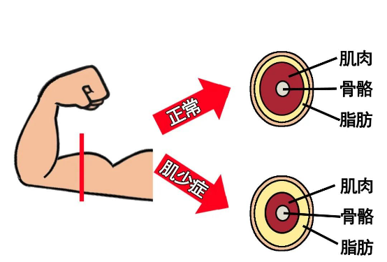 肌少症为一种增龄相关的肌肉量减少、肌肉力量下降和(或)躯体功能减退的老年综合征。临床最主要表现为四肢骨骼肌质量与功能的下降,还可增加患者跌倒和骨折的风险、降低体力活动表现、提升入院就医频率与次数、加重护理负担,甚至增加死亡风险等。